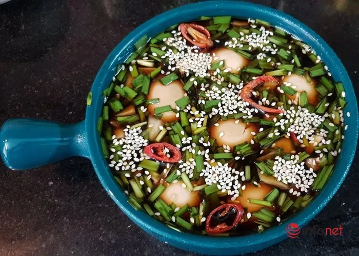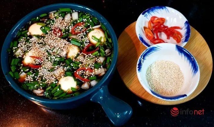 Trộn đều hỗn hợp nước tương, nước lọc, đường, rượu trắng, sau đó đun sôi, để nguội. Tiếp đó cho vào lá hẹ, vừng rang, ớt, hành tây.