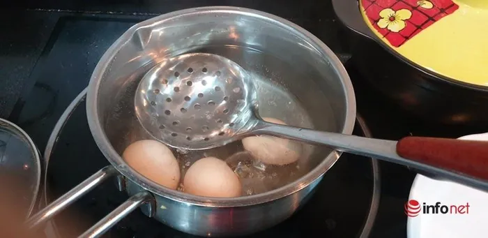 Trứng gà luộc lòng đào: đun sôi nước rồi hạ lửa cho lăn tăn, thả trứng vào nhẹ bằng muỗng để tránh vỡ trứng. Cho thêm 1 chút dấm và ít muối trắng để dễ bóc vỏ trứng sau đó.