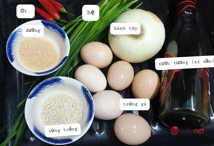 Lá hẹ (hoặc hành lá) thái nhỏ, ớt thái lát mỏng, hành tây thái miếng to hơn hạt lựu 1 chút; vừng trắng rang chín hoặc quay lò vi sóng khoảng 45 giây cho chín.