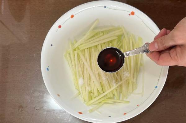 Bước 2: Cho su hào thái sợi vào bát tô, thêm muối và nước mắm vào trộn đều rồi để yên trong 10 phút.