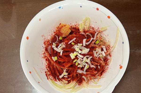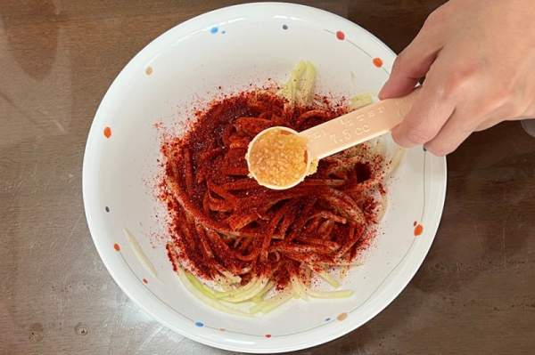 Bước 3: Su hào sau khi trộn mắm thì thêm ớt bột và tỏi băm vào.
