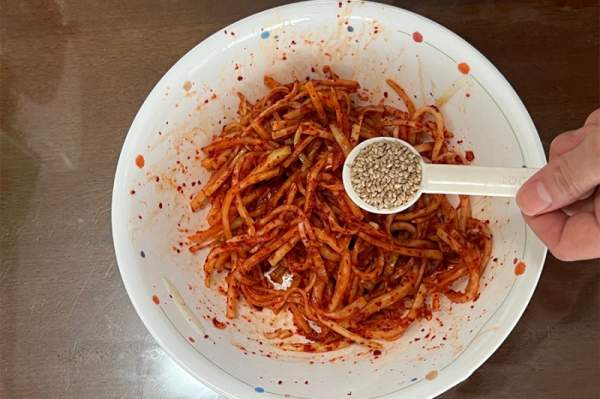 Cuối cùng thêm chút mè rang vào trộn đều là xong. Nếu bạn thích ăn ngọt thì có thể thêm chút đường vào trộn chung.
