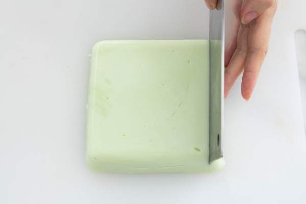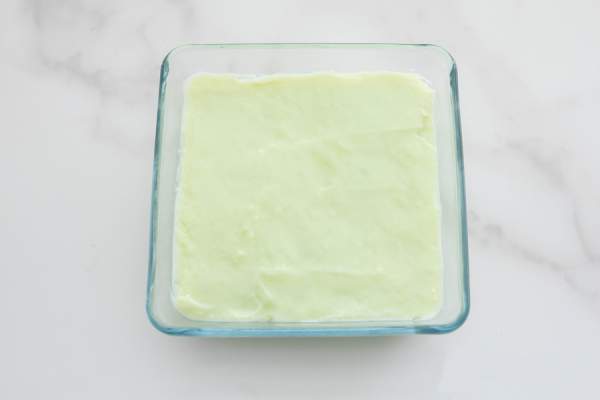 Đổ bánh sữa vào hộp hoặc khuôn, dàn đều rồi để vào ngăn mát tủ lạnh cho đông đặc và làm mát.