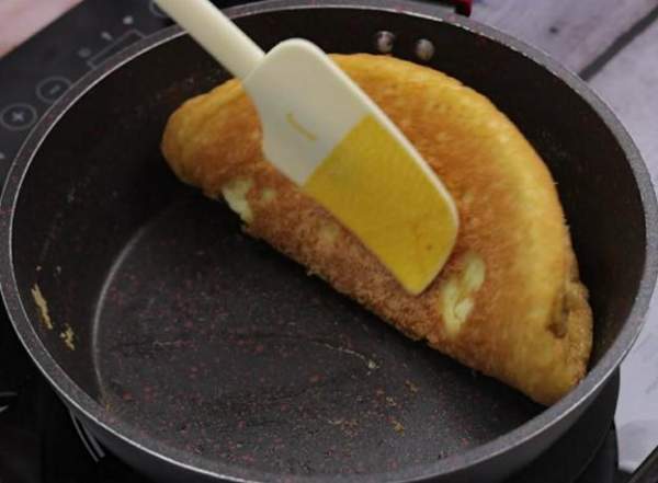 Lúc này bạn mở vung, gập đôi miếng trứng thành bánh trứng lại và đun thêm 1 phút nữa. Lưu ý là lật mặt bánh trứng cho lớp bên trong được nóng đều nhé.