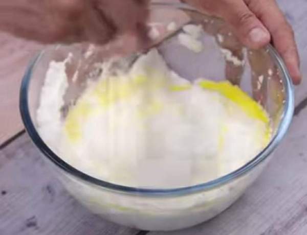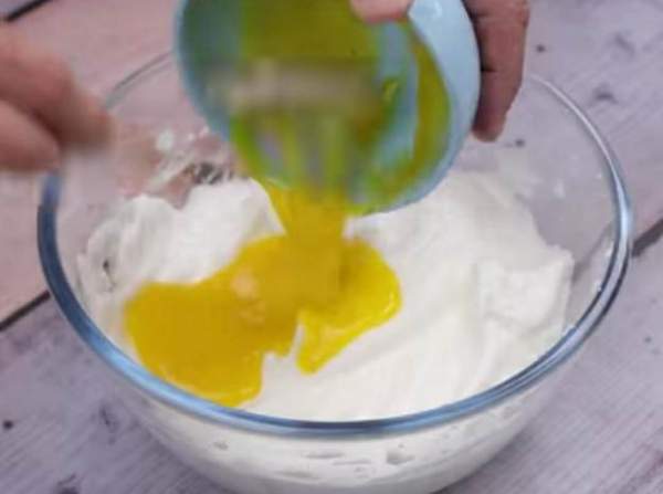 Tiếp đó đổ bát lòng đỏ đã khuấy và bát kem lòng trắng trứng gà