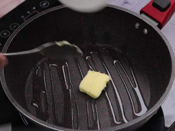 Tiếp đó, bạn bắc một chiếc chảo chống dính, cho một chút dầu oliu và một miếng bơ nấu ăn