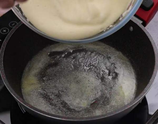 Khi dầu và bơ đã nóng chảy, bạn đổ bát trứng gà đã khuấy đều vào chảo