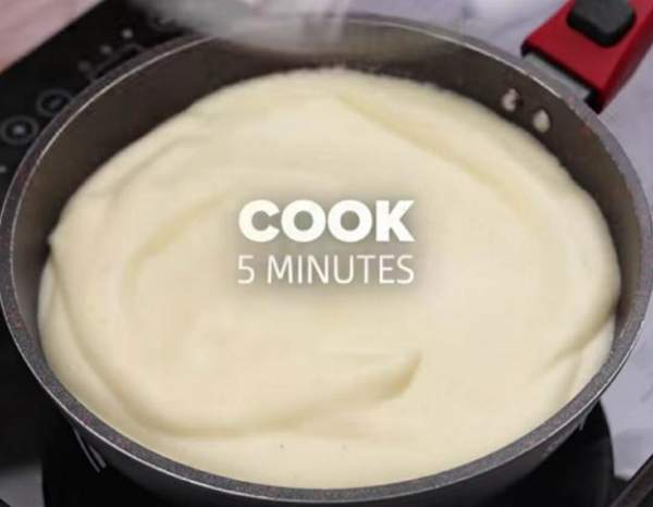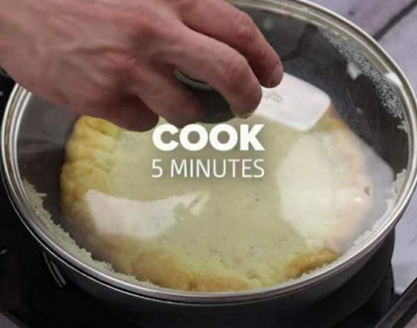 Dàn kín mặt chảo như hình hướng dẫn rồi đậy vung, đun ở lửa vừa trong vòng 5 phút