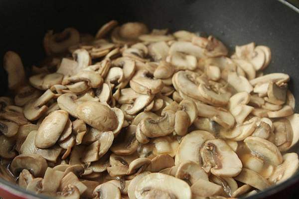 - Cho 1 thìa dầu ăn vào chảo, sau khi dầu nóng cho tỏi băm vào, đổ nấm mỡ đã cắt vào xào, nấm sẽ dần mềm và tiết ra nước.