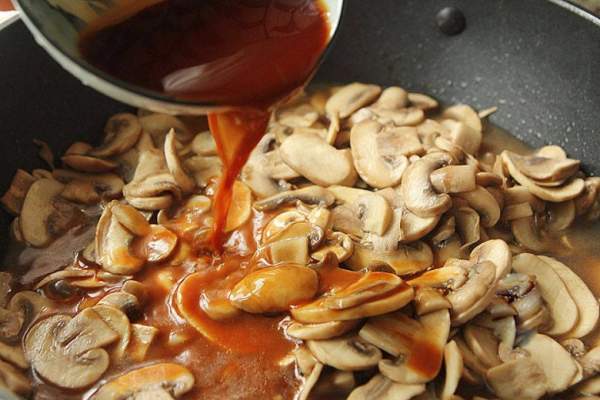 - Thêm dầu hào, nước tương, nước tinh bột vào chảo, đậy nắp đun nhỏ lửa trong 5 phút, khi nước sốt sệt lại thì tắt bếp, cho nấm xào ra đĩa.