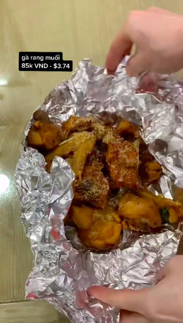 Corrin tự order một phần gà rang muối và một phần gà quay thường để review. Suất rang muối có giá 85k