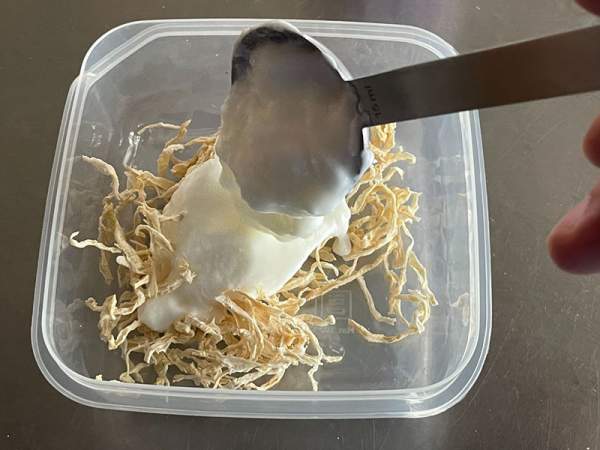 Trộn sữa chua với củ cải khô rồi để trong tủ lạnh nửa ngày để củ cải hút nước từ sữa chua và nở ra. Cắt nhỏ dưa chuột và xúc xích. Trộn tất cả các thành phần lại với nhau là xong.