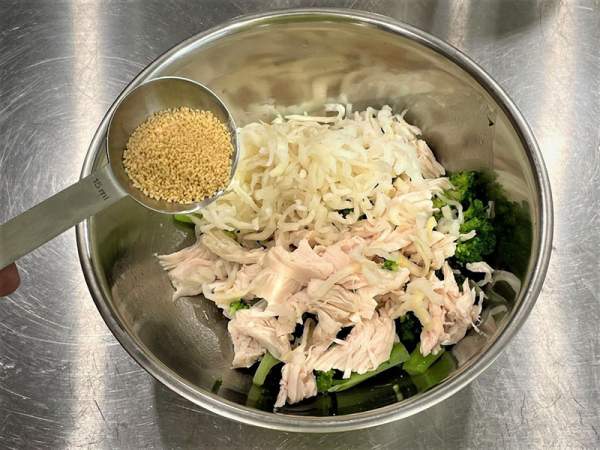 1 nhúm củ cải khô, 2 miếng ức gà, 1/2 bó bông cải xanh, 1/2 muỗng dầu mè và nước gia vị mặn ngọt tự pha. Bạn có thể dùng sốt dầu mè hoặc sốt mặn ngọt tùy theo khẩu vị của mình.