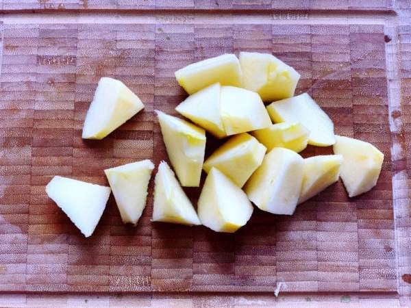 Sau đó rửa sạch táo, gọt bỏ vỏ ngoài, bỏ lõi và cắt thành từng miếng nhỏ. Táo rất dễ bị oxy hóa, chỉ nên cắt nhỏ trước khi xay, không nên cắt trước vì bề mặt sẽ bị oxy hóa và bị thâm.