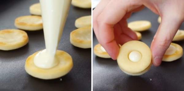 - Lấy bánh ra khỏi lò và để nguội. Cho phần sữa đặc còn lại vào túi bắt kem, cắt 1 lỗ nhỏ và bơm sữa vào giữa đế bánh quy rồi ghép phần bánh đã đục lỗ lên trên để tạo thành một chiếc bánh hoàn chỉnh.
