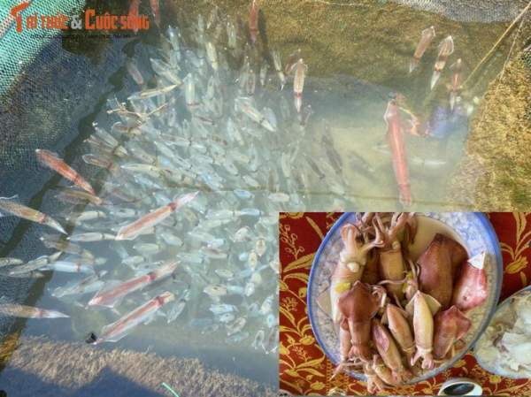 Mực nhảy tươi sống được vớt lên từ lồng nuôi rửa sạch để nguyên con đem luộc hoặc hấp bia ăn tươi ngon hấp dẫn khó quên. Theo chủ nhà bè Hùng Xuân do mới bước vào đầu mùa nên mực nhảy còn hiếm, 1kg mực giá dao động từ 600 đến 700 ngàn đồng.