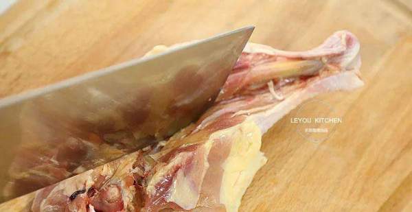 Lật miếng đùi gà lại, ở giữa dọc theo đầu đùi gà, dùng dao chặt ra như trong hình.