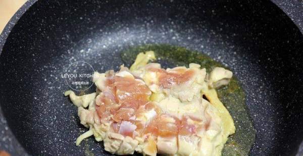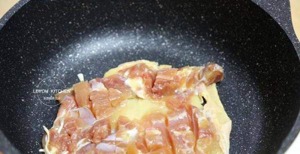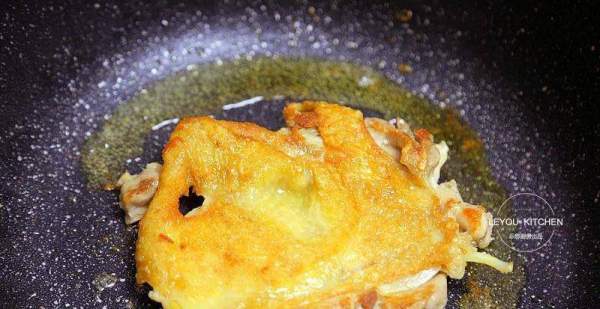 Bước 5: Bắt đầu chiên gà. Đun nóng chảo, không cần thêm dầu, cho mặt có da gà xuống chảo như trong hình.