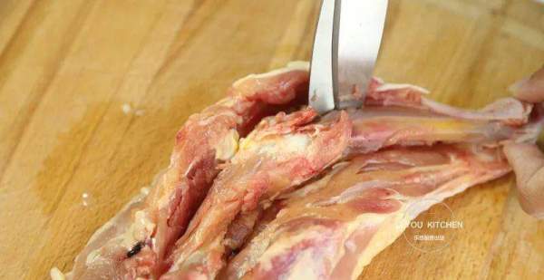 Dọc xương, dùng kéo cắt thịt gà như hình.