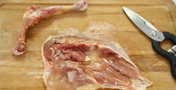 Bước 1: Lọc bỏ xương đùi gà. Bạn có thể mua sẵn đùi gà đã lọc xương. Nếu tự làm ở nhà, bạn có thể làm theo cách sau, cũng rất đơn giản.