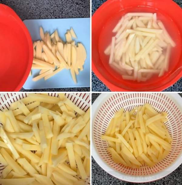 Sau khi gọt vỏ khoai, bạn phải ngâm ngay vào chậu nước để khoai không bị thâm. Lúc thái khoai cũng phải ngâm trong chậu nước. Thái xong hết thì rửa khoai với nước sạch để các tinh bột khoai thừa trôi hết. Làm như vậy khoai sẽ không bị dính khi chiên và không bị nhanh mềm.