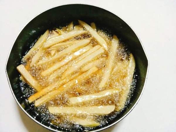 Đổ một lượng dầu thích hợp vào nồi. Khi dầu bắt đầu nóng lên thì chuyển sang lửa vừa. Đổ khoai tây đông lạnh vào (không cần rã đông). Chiên đến khi khoai chín vàng giòn thì vớt ra để ráo dầu.