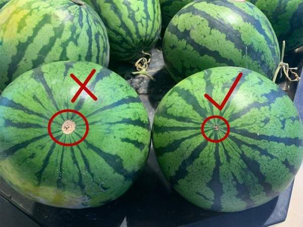 Bạn có thể nhìn vào rốn của quả dưa để đánh giá độ ngọt của quả. Phần rốn là phần đáy dưới của quả dưa, chỗ mà hoa dưa hấu đã rụng và để lại vết.