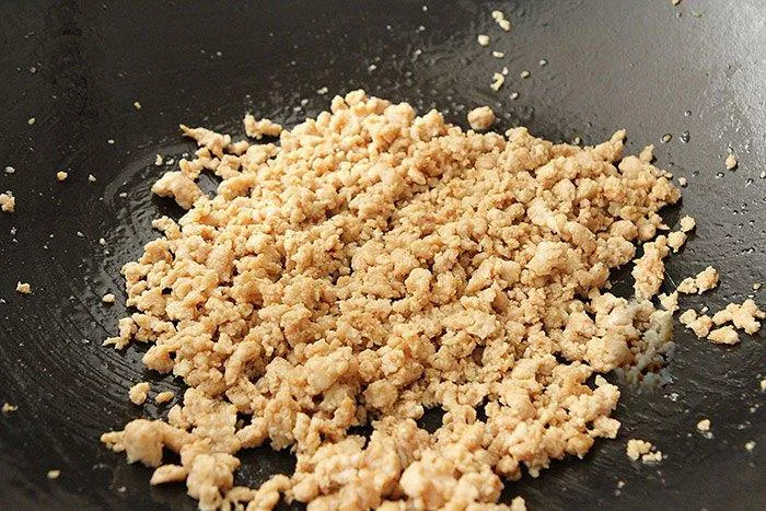 Đổ dầu ăn vào nồi, đun nóng dầu ăn rồi cho gừng và tỏi vào xào cho thơm. Sau đó, cho thịt băm đã chuẩn bị vào xào cùng, xào cho đến khi thịt chuyển sang màu nhạt, tắt bếp, cho thịt ra đĩa để riêng.