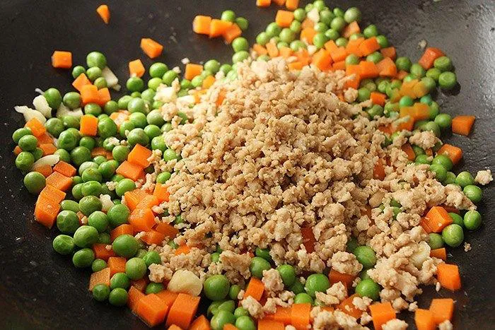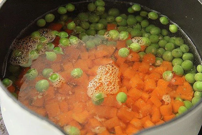 Cho nước vào nồi, thêm một thìa muối và vài giọt dầu vào đun sôi (để đậu Hà Lan giữ được màu xanh), cho hạt đậu vào luộc chín. Cho cà rốt vào nồi đun sôi khoảng 2-4 phút là được, chắt nước và để riêng.