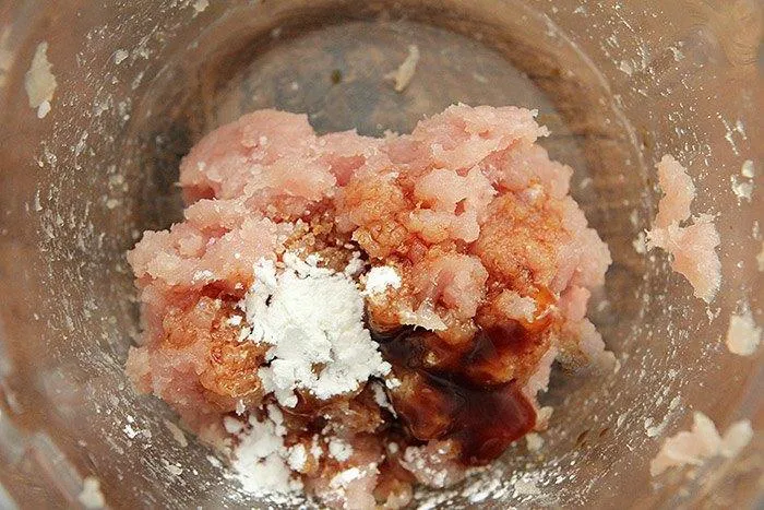 Băm nhuyễn thịt lợn, thêm nước tương, hắc xì dầu và tinh bột, đảo đều và ướp trong 15 phút.