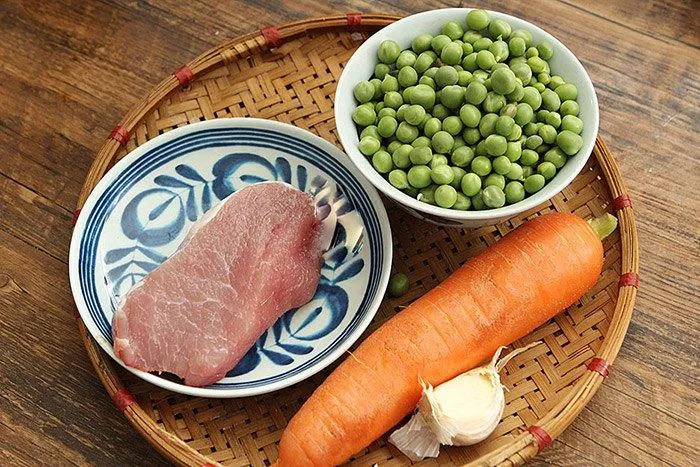 - 1 bát con hạt đậu Hà Lan, 150g thịt lợn ngon, 1 củ cà rốt nhỏ, 2 nhánh tỏi, 1 thìa nước tương, 1 thìa hắc xì dầu, 1 thìa dầu hào, 1 thìa muối, 1 thìa cà phê tinh bột ngô hòa với 1 thìa cà phê nước thành nước tinh bột