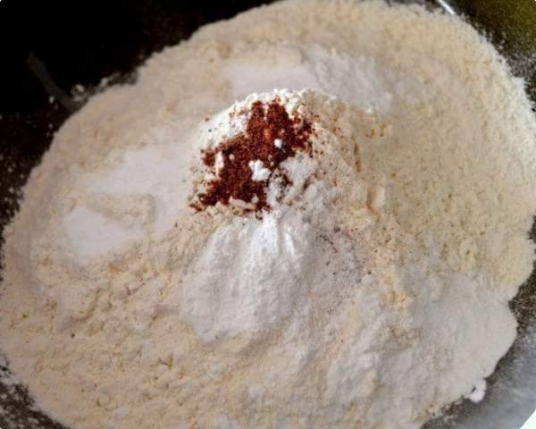 3. Cho bột mì, baking soda, bột nở, muối và nhục đậu khấu vào bát rồi trộn đều lên.