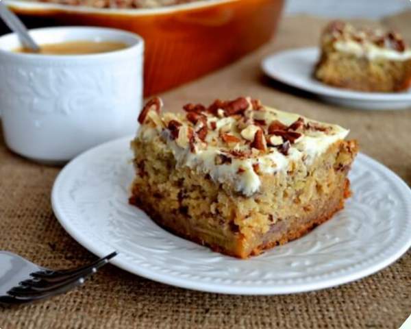9. Bánh chuối chín, bạn nhấc ra, để nguội hoàn toàn thì phết hỗn hợp kem phủ vừa tạo lên. Rắc hồ đào nướng lên trên là hoàn thành.