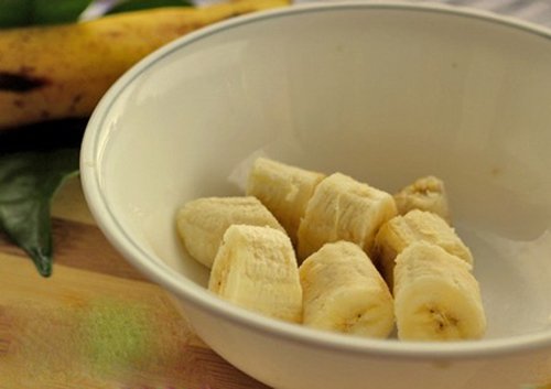 Chuối bóc bỏ vỏ và thái từng miếng nhỏ rồi cho vào một cái bát sạch.