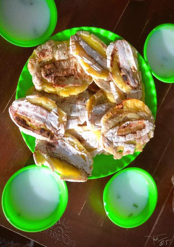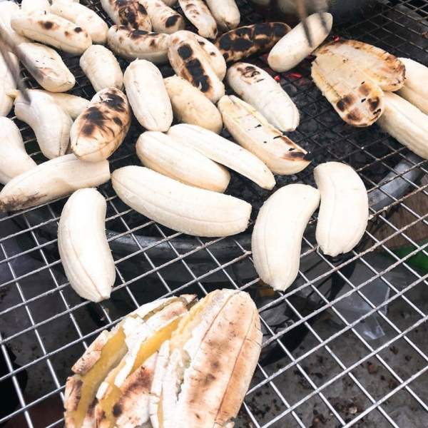 Chuối chín đã thơm nay được đem đi nướng, hòa cùng mùi bếp than hồng càng tăng thêm phần kích thích, chỉ ngửi thôi cũng đã thấy bụng cồn cào. Những miếng chuối nướng vàng nhạt phải có thêm chút vệt cháy sém bên ngoài mới hấp dẫn, chính lớp cháy nhẹ ấy đã góp phần làm món ăn tỏa hương và ngon miệng hơn.