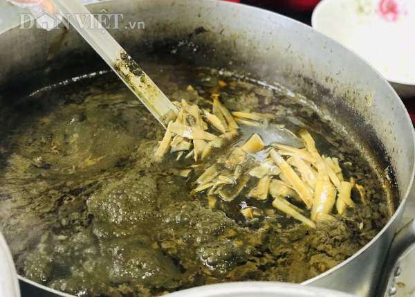 "Sau khi có được nồi nước dùng, mình bắt đầu dùng măng tươi thái mỏng cho vào nồi nước cua sôi trên bếp lửa liu riu. Đun càng lâu, măng càng tiết ra nhiều vị ngọt khiến nồi bún cua thối càng ngon. Khi ủ nước cua phải ủ đủ, đúng thời gian, nếu mùi nặng quá cũng không ngon mà ít mùi cũng không ngon. Còn về trứng vịt, sau khi luộc chín, thì bỏ vào nồi nước dùng", cô Chi chia sẻ thêm.