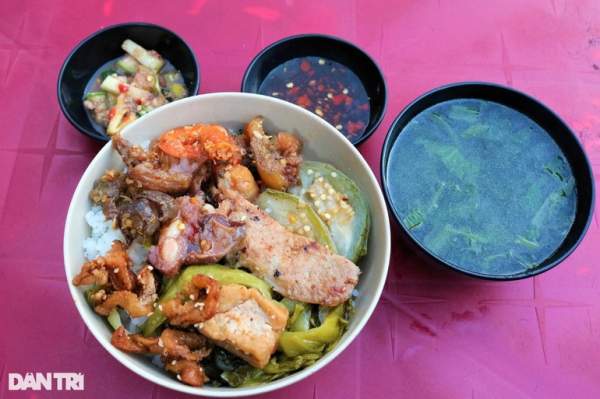 Khẩu phần cơm bình dân nhưng không phải được bày biện trên đĩa hay chén như ở các quán ăn khác mà được bày sẵn trong chiếc tô sứ màu trắng.