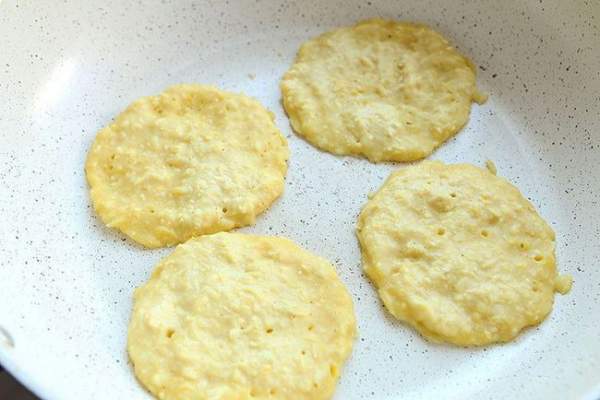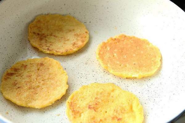 Đun nóng chút dầu ăn trong chảo chống dính, sau khi dầu nóng, bạn quét một lớp dầu lên trên mặt chảo và dùng thìa để xúc. Cho một thìa bột ngô vào để chiên. Bạn có thể chiên cùng lúc nhiều cái nhưng giữa những chiếc bánh cần có khoảng cách để chúng không bị dính vào nhau.
