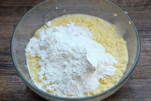 Thêm một ít bột mì vừa đủ, không nên cho nhiều bột quá bị khô không ngon. Nên cho từ từ, vừa cho vừa khuấy theo một chiều đến khi nào bột vừa sệt là đạt.