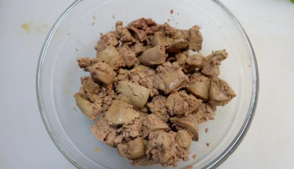 Gan gà luộc chín để ráo nước, bóp thành từng miếng nhỏ.