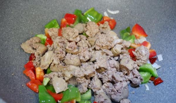 Cho ớt màu ngọt vào xào chảo, thêm gan gà vào, nước tương, bột thìa là, một ít muối điều chỉnh khẩu vị, đảo đều.