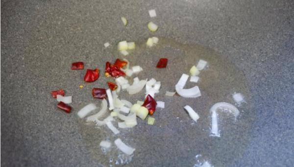 Hành lá cắt khúc, ớt khô băm nhuyễn. Phi thơm hành tỏi ớt.