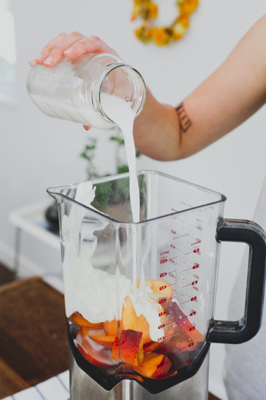 Cho đào và gừng vào máy xay sinh tố, thêm nước cốt dừa để tạo độ ngọt sánh.