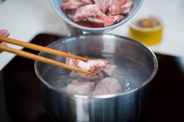 Đun sôi nồi nước, chần sườn heo trong 5 phút và loại bỏ váng. Lây sườn ra khỏi nồi, rửa sạch và để sang một bên.