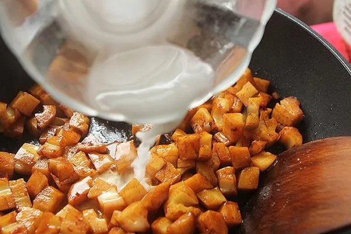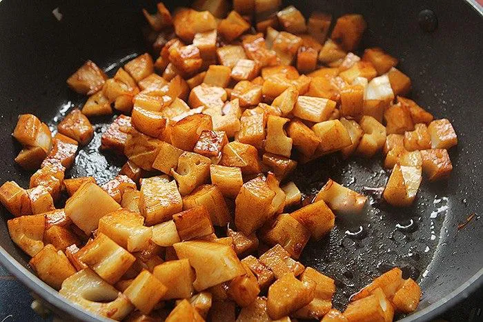 - Đổ hỗn hợp nước sốt đã khuấy đều vào nồi, đảo đều đến củ sen ngấm đều gia vị.