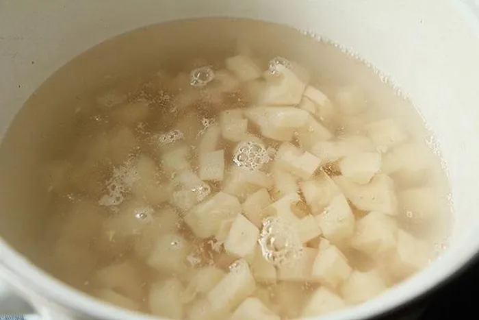 - Đun nửa nồi nước, khi nước sôi thì cho củ sen vào và luộc trong 3 phút, sau đó vớt ra cho vào chậu nước lạnh. Thêm vào chậu một thìa dấm để củ sen không bị thâm đen và giữ được độ giòn.