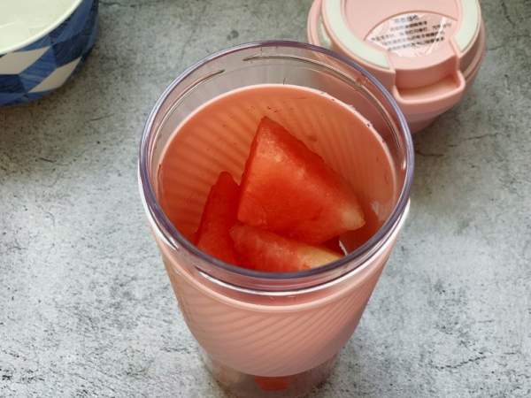Bấm nút và xay nhuyễn dưa hấu. Lưu ý, mỗi lần xay chỉ bỏ lượng dưa hấu vừa đủ vào máy.