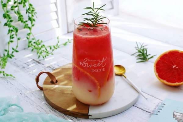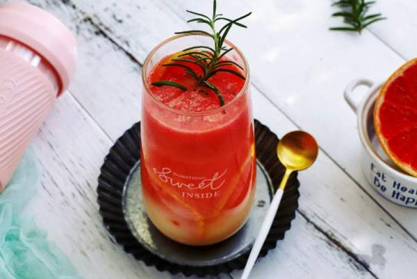 Cuối cùng, đổ dưa hấu đã xay vào, thêm nhánh hương thảo lên trên để trang trí.