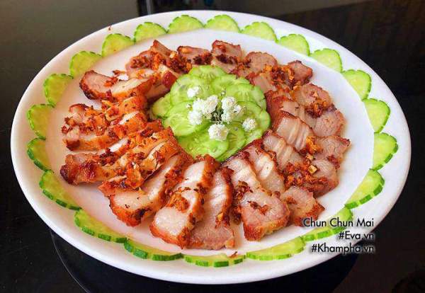Thịt chín vàng đều cho ra đĩa, lấy giấy thấm dầu thấm đều xung quanh cho bớt mỡ. Sau đó thái miếng vừa ăn, xếp ra đĩa. Lấy sả, tỏi, ớt đã phi thơm ở trên rắc lên trên ăn cùng thịt chiên.