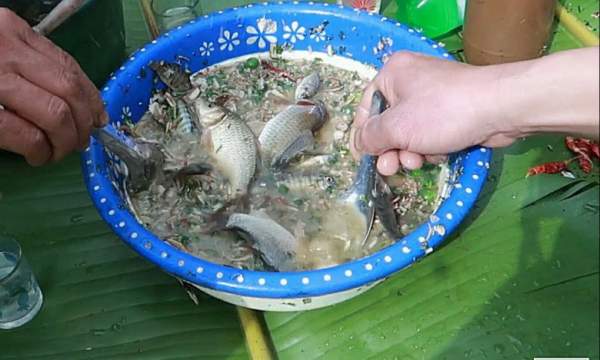 Ăn món này cũng phải đúng kiểu của người Thái. Đầu tiên bắt một con cá rồi dùng dao rạch bụng, nặn bỏ hết ruột ra ngoài, nhanh chóng bỏ vào hỗn hợp rau thơm - gia vị khi nãy rồi dùng thìa múc cả cá lẫn lõi chuối và nước chua để thưởng thức.